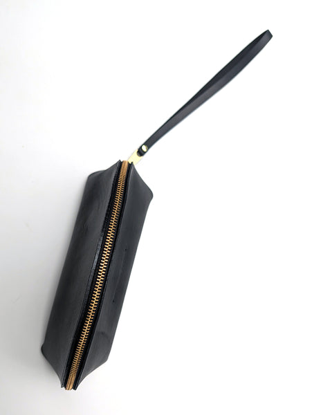 - Brass Zipper pulls shut with a looped leather zipper pull